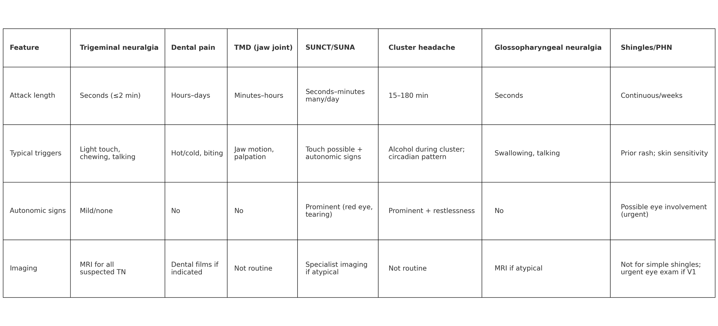 Clues against TN: pressure-like, prolonged pain; no electric shocks or light-touch triggers. nhs.uk